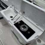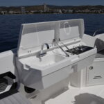 The teack table can be mounted in the cockpit or cabin, while the small galley in the cockpit benefits from a sink, burner and a small worktop. Underneath there is a refrigerated box on the lid of which there are holders for glasses and a ruler for measuring the caught fish. At night, the cockpit can be illuminated with LED lights.