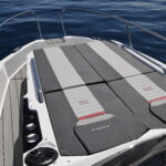 The bow is occupied by two sun loungers, which can be adjusted to three positions. From the cockpit you can easily reach the bow thanks to the wide passage area and well protected by the dashboard and the high balcony handles. On either side of the beach area are built-in audio speakers and cup holders. The anchor is discreetly concealed in the plank, and the opening above it can be used as passages for access to and from the boat to the quay.